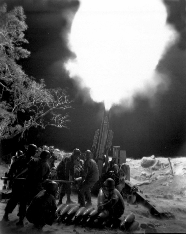 5 Veteran Artillerymen of the ‘C’ Battery, 90th Field Artillery lay down a murderous barrage on Japanese artillery positions in Balete Pass, Luzon, Philippine Islands.Image Source: Imgur