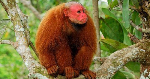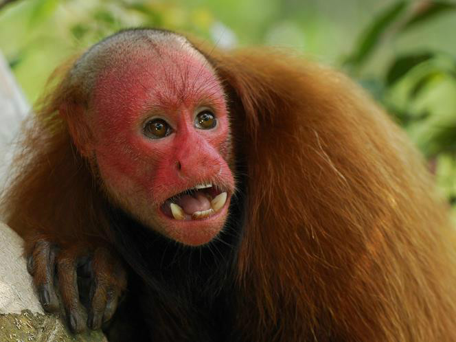 The Uakaris are small primates found in South America. They are completely bald headed and possess a vibrant red face.