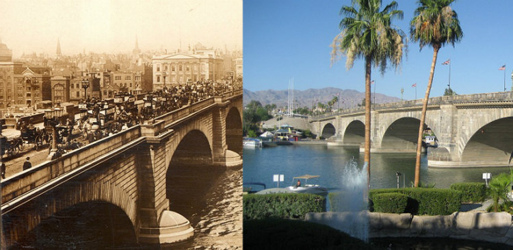 The 1831 London Bridge was built by John Rennie and his son across River Thames. In 1967, the bridge was dismantled, after being sold, to be shipped to Arizona. The bridge finished being reassembled in 1971 across Lake Havasu which McCulloch received from the US government for free with a promise to develop it. It took almost a year to take the bridge apart, ship it to Port of Long Beach and transport it by land to the lake. The assembly and reconstruction took around three years to finish.(source)