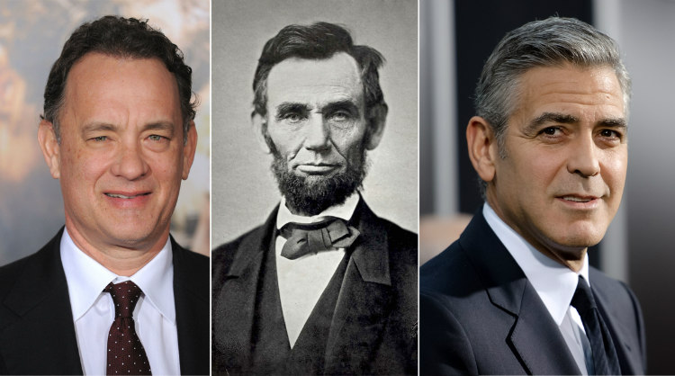 Taking around three centuries into account, the historians of Ancestry found that George Clooney is related to Lucy Hanks, the maternal grandmother of Lincoln. That makes Clooney the half-first cousin five times removed of Lincoln. Tom Hanks, on the other hand is related through the president’s mother, Nancy Hanks. That makes Hanks third cousin, four times removed.(source)
