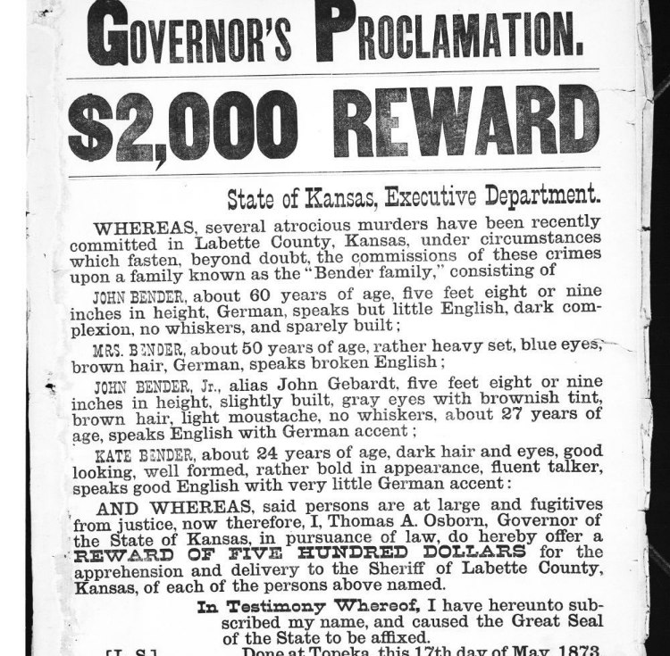 Dr. York’s other brother, State Senator Alexander York, offered a reward of $1,000 ($19,786 as of 2016) for catching the Benders and on May 17, 1873, Kansas Governor Thomas A. Osborn offered a $2,000 ($39,572 as of 2016). However, the only result was several vigilantes and vigilante groups claiming to have killed one or all of the Benders.Image Source: murderpedia