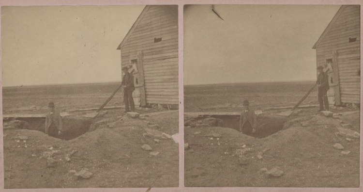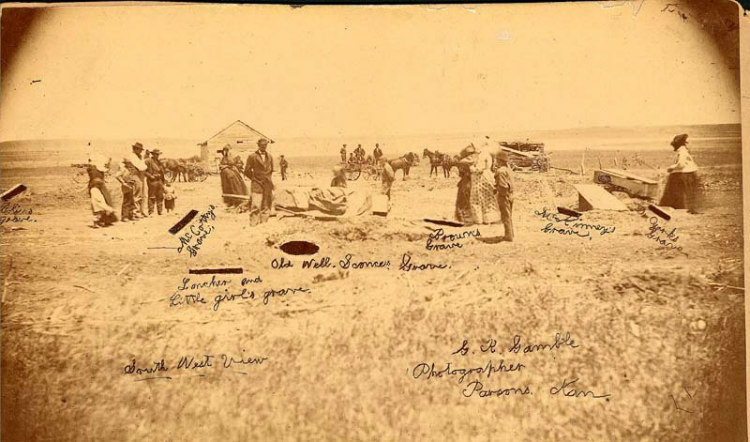 When York and some people from the town searched the cabin, they found a room under a trap door with clotted blood. Then, a large number of volunteers started digging outside the cabin and more than eight dead bodies were found buried in the vegetable garden and apple orchard. Digging Up Dead Bodies. Image Source: kansasmemory.org