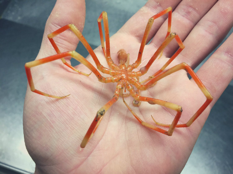 Image Source: rfedortsov This one is an orange-colored sea spider, a marine arthropod with legs that are extremely long compared to its body size.