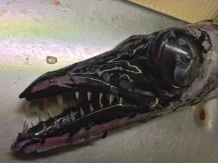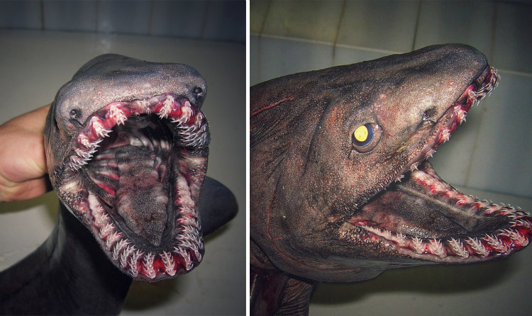 This strange-teethed eel-like fish is called frilled shark, an extant species of sharks. Its features are considered so primitive that it is called a “living fossil”.Image Source: rfedortsov This black scabbardfish has huge glassy eyes and teeth like daggers.