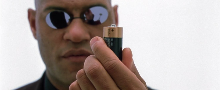 Duracell batteries are also referred to as copper tops. The same battery is shown by Morpheus when he explains Neo how the human race has become a source of energy for the machines. (source)