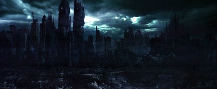 The machine city is yellow (gold) and signifies the realm of spirit or heaven.