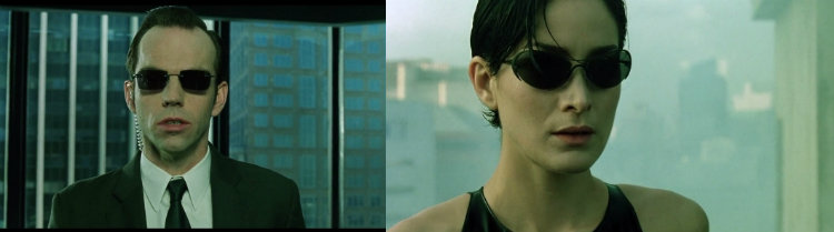 Sunglasses are an integral part of the movie’s costumes and have either rounded or rectangular lenses. The agents, who are sentient programs, wear the rectangular sunglasses while the renegade group wears the rounded ones. The round shape of the lens suggests that the renegade group are the real ones while the agents are with the machines. Even taking off the sunglasses was used to symbolically represent taking off a mask and expressing vulnerability as in the Morpheus’ torture scene where he is without his glasses, or being forthcoming as Agent Smith tries to be while interrogating Neo. (source)