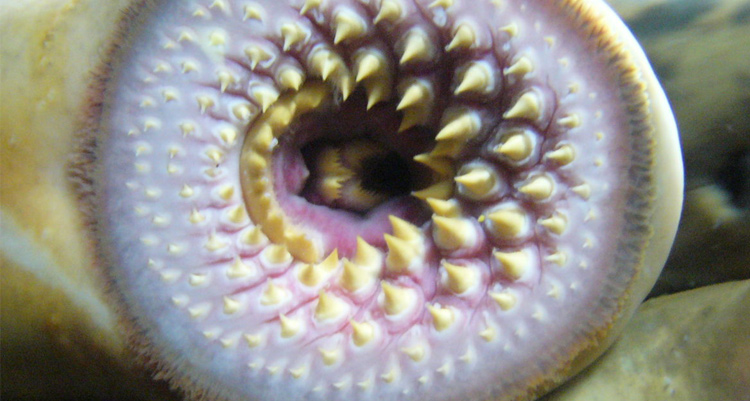 The characteristic feature of lampreys is their mouth, which is a toothed funnel-like opening that attaches itself to its prey and sucks the blood by boring holes through the flesh.Image credits: Drow_male via wikipedia