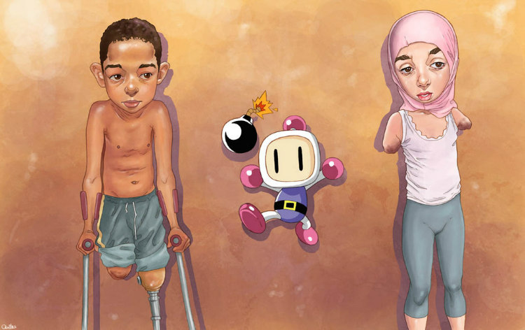 Image Source: quilesart Bomberman is about the negligence of the government in clearing landmines over which many children play unaware of the danger. It also refers to Bomberman, a maze-like game in which strategic placing of bombs is used to destroy enemies and obstacles.