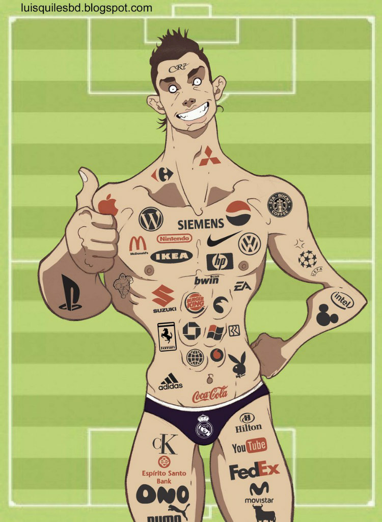 Image Source: quilesart The illustration Football is about how the players are made to advertise for their sponsors or endorse products but at the same time they also take part in NGO activities “to clear their conscience”.