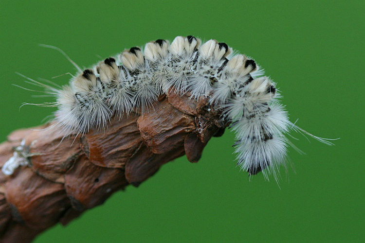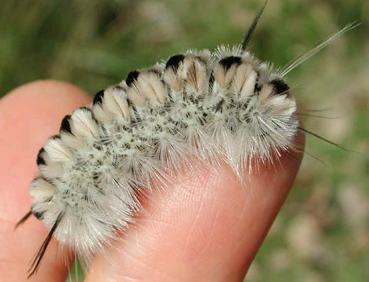 The caterpillar has what are known as setae, bristle or hair like structures on its body, that are spread out in tufts. Hickory tussock has white colored setae over its body and also black colored tufts along the center of its back. These hairs are what cause allergic reaction on the skin because of the toxins they contain. Rashes similar to those caused by poison ivy or nettles can occur upon contact. The hairs also have microscopic barbs and care must be taken not to rub eyes or touch eyes after if hands are used to hold it or touch it.