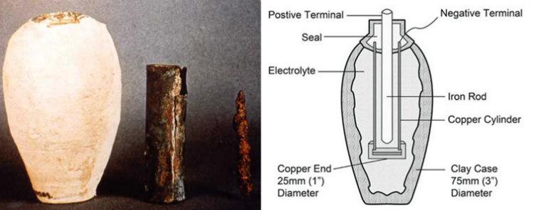 The Baghdad battery is a 6-inch yellow clay pot found in the Baghdad Museum and dates back to the Parthian occupation between 248 BCE and 226 BCE. It consists of a cylinder made of copper sheet attached to the pot’s mouth using a seal of 60%-40% lead-tin mixture, which can be compared to today’s cement. A folded copper disk is attached to the bottom of the cylinder using bitumen, and at the top an iron rod is suspended into the cylinder using more bitumen.