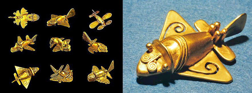 The Quimbaya artifacts are a set of over 100 gold figurines, made by the Quimbaya civilization, dating between 300 and 1000 AD. These figurines were found in Colombia and measure between 2 and 3 inches in length. While archaeologists say that these are all zoomorphic, representing birds, fish, bats, insects and mammals, astronaut theorists say that they represent ancient flying machines, as quite a lot of them do not resemble any known animals. They are thought to have complete aerodynamic features, with stabilizers and fuselage. In 1994, two Germans created and flew large-sized simplified radio-controlled models of the figurines, though lacking many of their more complex features.(1, 2)