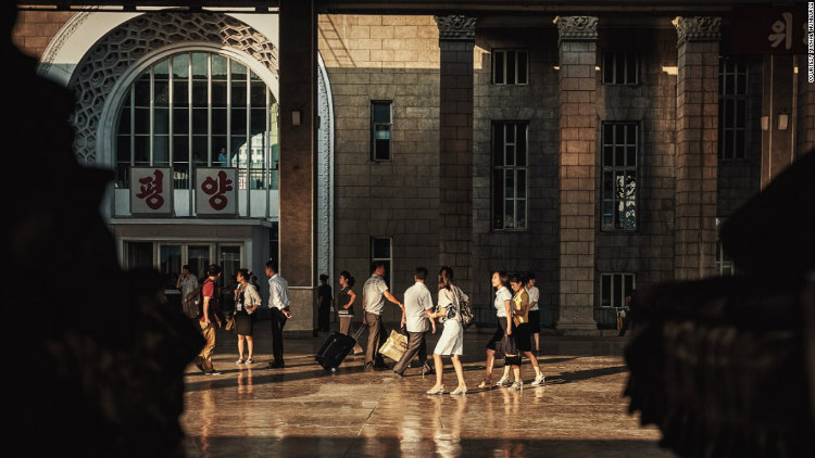 1 The scene that greets the tourists upon their arrival in Pyongyang. A group of men and women who appear to be walking in a hurry so that the station doesn’t look empty. The train in which Huniewicz arrived was the only train that day.