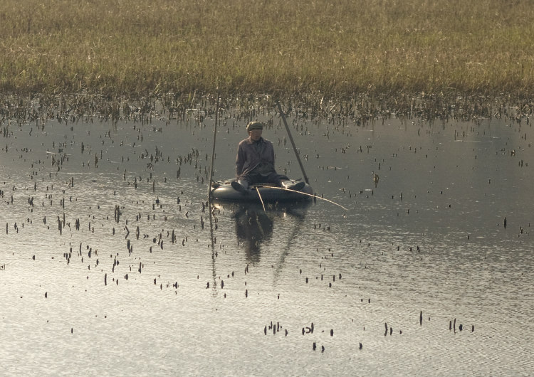 9 A man using an old tyre as a boat for fishing. Fishing in small lakes in the countryside is a way for those living in remote areas to get fresh food.