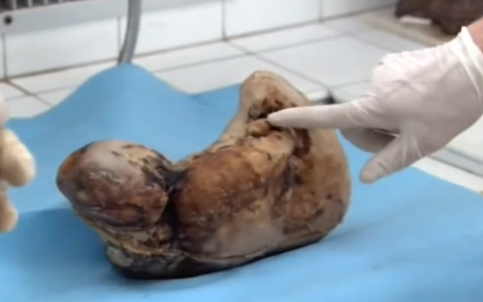 Zahra had an ectopic pregnancy, where the fetus had burst the fallopian tube and was developing in the Abdominal cavity. Later, the dead fetus has become a foreign material. Therefore, the motherâs body has formed a calciferous shell around it mummifying the fetus. Surgeons successfully removed the fetus from Zahra’s body.Image source: Documentary/YouTube
