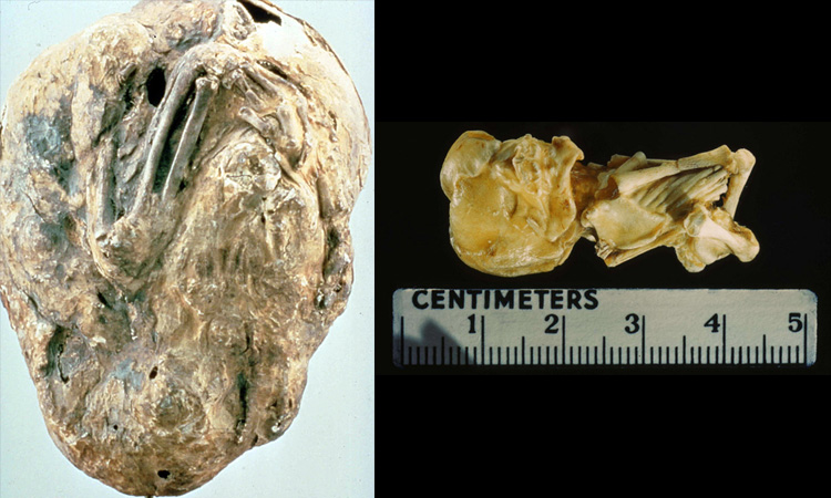 A calciferous shell that forms around the dead fetus to protect the mother from any infection causes the tissues of dead fetus to be dehydrated (mummified) making it a lithopedion or stone baby. It can occur from 14 weeks gestation to full term. The earliest mention of Lithopedion dates back to 1100 BC, Texas.