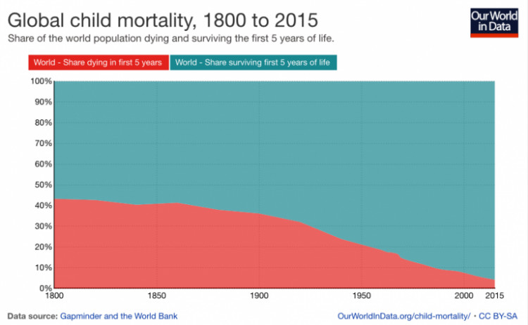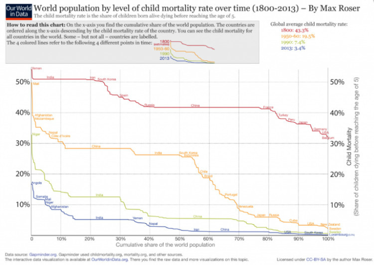 In 1960 child mortality was still 18.5%. Almost every 5th child born in that year died in childhood. Over the last few decades, child mortality has plummeted. According to the 2013 data records, global health has improved drastically, particularly in those countries that had the worst health in the 1950’s. They experienced the most dramatic improvements. China, for example, reduced its child mortality from 28.4% to now 1.3%. The global average child mortality rate fell to 3.4%, a tenfold lower rate than two centuries ago.(source)