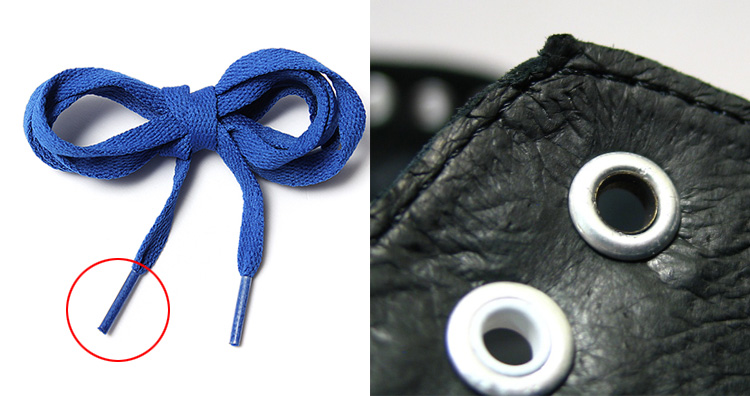 An aglet keeps the fibers of the lace firm and prevents it from unraveling. Its narrow profile makes it easier to hold and easier to feed through the eyelets. An eyelet is a ring inserted into a hole through the shoe tarps. The word “eyelet” comes from the Old French, “oillet”, which is diminutive of oil, meaning eye. The original word for “oillet” is “oculus” which means eye in Latin.(source)