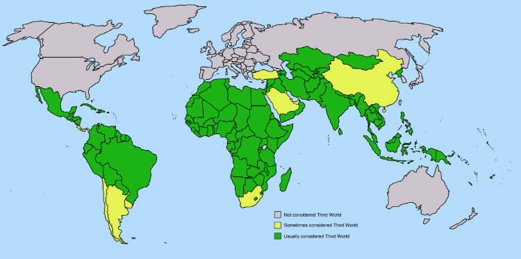 While reading or discussing the “Third World” issue, we usually associate them with countries considered poverty-stricken. But it is not the case. The term Third World is based on an outdated model of the geopolitical world at the time of cold war. The countries aligned with the US bloc were called First World while the countries with Russian bloc were called Second World. On the other hand, the term Third World includes communist (e.g., North Korea) countries as well as very rich (e.g., Saudi Arabia) and very poor (e.g., Mali) countries. Thus, the Third World can be roughly described as those countries who didn’t align with either the US bloc or the Soviet bloc after World War II.(source)