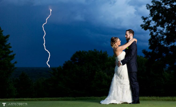 On August 13, 2016, wedding photographer, Justin Tibbitts, was shooting a wedding at the Albany Country Club. Waterford couple, Katherine and Greg Cresci, were busy in their wedding ceremony when a massive storm started rolling through. When Justin saw the storm, he ran in and grabbed the bride and groom. Even though they were just sitting down to dinner, Justin convinced them to go outside. While his assistant illuminated the couple from the side, he sat down on the ground balancing the camera on his knees. He kept his eyes locked on the viewfinder waiting for a flash in the sky. After a few minutes of waiting, he saw the flash in the viewfinder. Instantly he clicked on the shutter and captured one of the rarest shots known in wedding photography. He captured a full lightning bolt along with Katherine and Greg embracing each other. (source)
