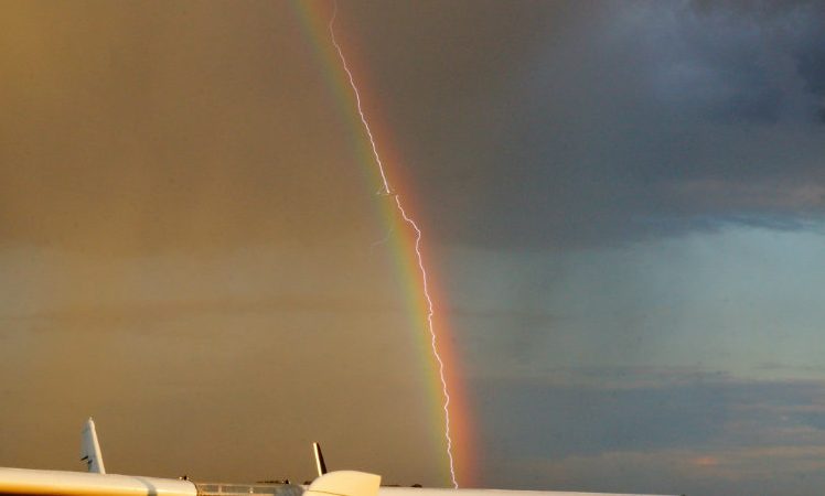 4 Lightning strikes a cargo plane as it flies near a rainbow.Image Credit: Birk Möbius