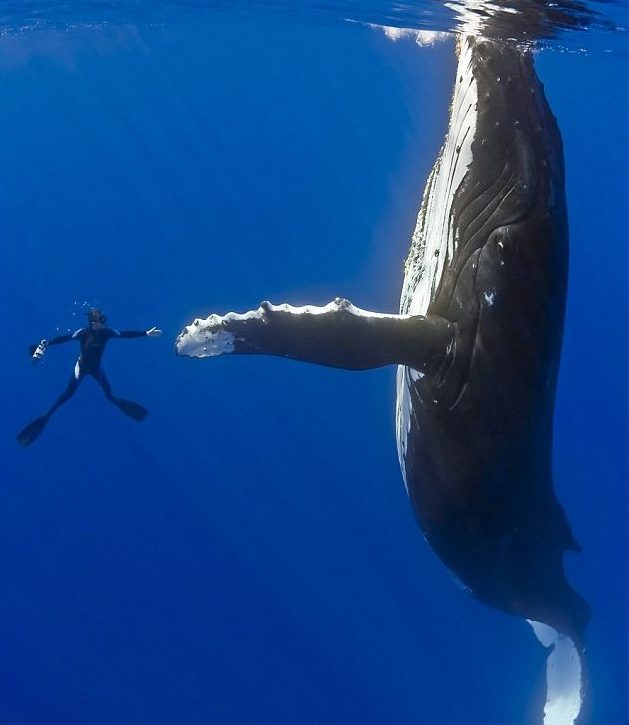 Forty-two-year-old Marco Queral has spent seventeen years of his life trying to capture remarkable pictures. Along with being a photographer, he is also an experienced diver. Once while exploring in the deep blue waters of the South Pacific, Queral got up close and personal with a humpback whale. The fifty-foot female got curious about Queral and started swimming along with him. During this time the photographer was extremely careful as even a flip of the whale’s tail would have killed him. He took many images during this encounter with the whale. The photograph above is one of them showing the diver extending his arm towards the whale. One of the flippers of the whale is extending out which gives the impression that the whale is giving a high five to the diver. (source)