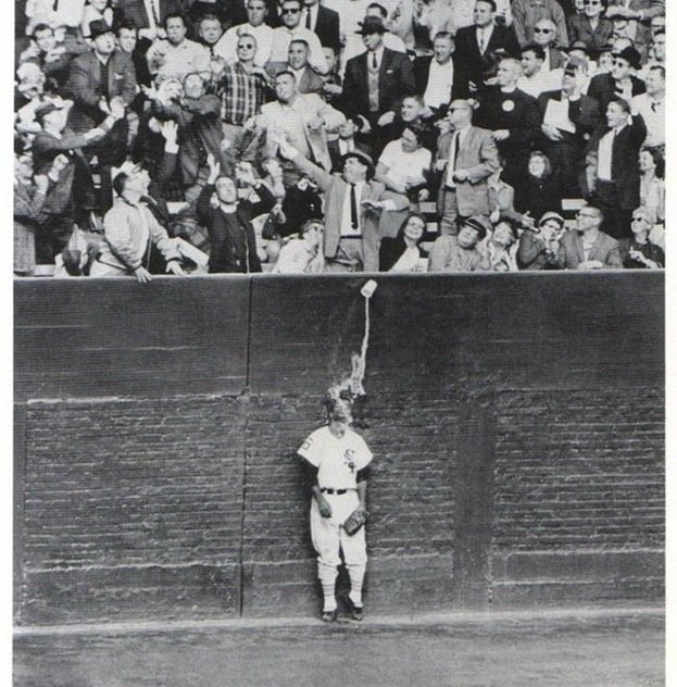 It was October 2, 1959. The Los Angeles Dodgers were playing the Chicago White Sox at Comiskey Park in Chicago, Illinois. The game started at 1:00 pm. American Major League Baseball player, Alphonse Eugene Smith, was playing for the Chicago White Sox. Suddenly, Charlie Neal of the Dodgers hit a long drive, and Smith retreated to the left field wall in its pursuit. Smith watched the ball sail into the third-row seats for a home run.  At that moment a fan, Melvin Piehl, an executive for a motor-oil company, seated in the first row tried to catch the ball accidentally tipping over his cup of beer and dousing Smith’s head and face. This moment was captured by AP Chicago Tribune staff photographer John Raymond Gora. The photograph became so popular that Smith claims he has autographed copies of it 200,000 times for baseball fans. (1,2)