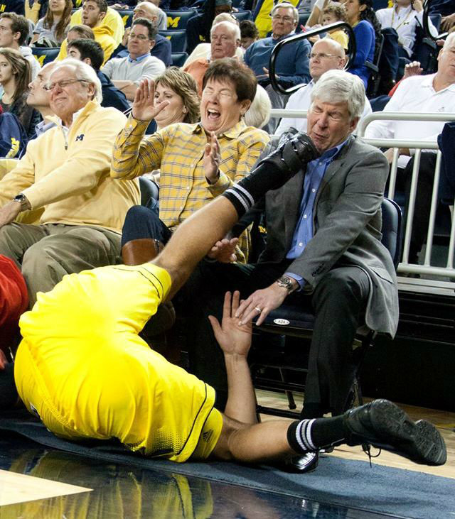 November 27, 2012, was a day of leisure for Michigan Governor Rick Snyder. He and his wife Sue were watching a NCAA basketball game in Ann Arbor, Michigan. The game was between the Michigan Wolverines and the North Carolina State Wolfpack. During the second half of the game, Michigan’s Mitch McGary took a spill. As he landed on the floor, his left sneaker almost struck the governor’s face. This moment was captured by Detroit Free Press photographer Julian H. Gonzalez. In the photograph, the governor’s wife’s is sitting beside him with a priceless reaction on her face. The game was won by Michigan Wolverines, but the sneaker’s incident was the highlight of the event. (1,2)