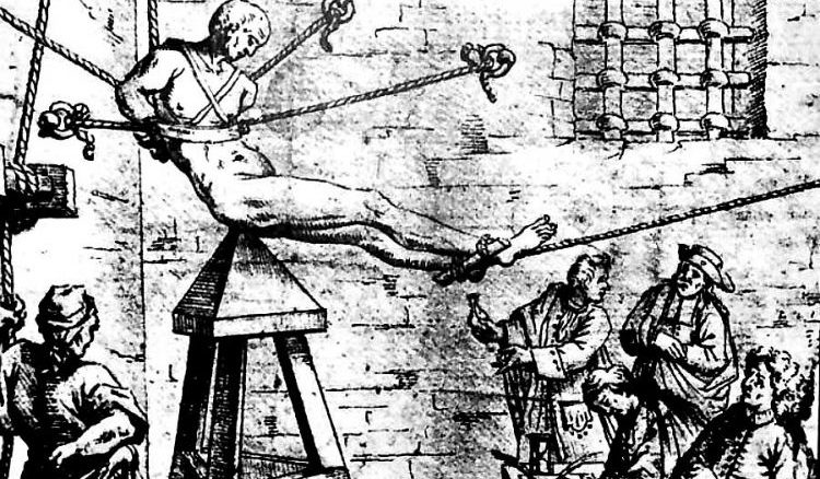 In this method of torture, if a defendant stood mute and refused to plead guilty or innocent, they would be subjected to having heavier and heavier stones placed upon their chest until a plea was entered, or they died.Image source: executedtoday.com