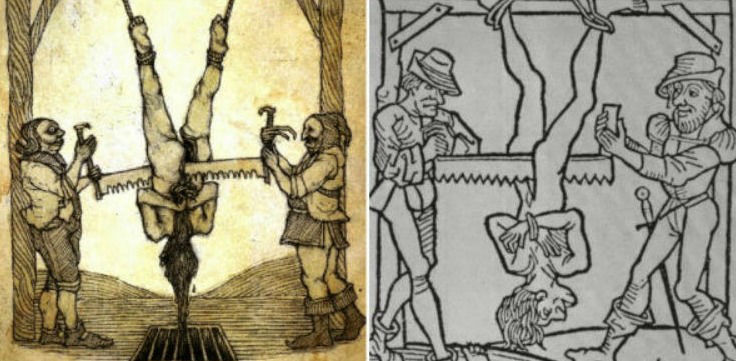Death by sawing was a rather famous torture method used in parts of ancient Rome, Spain, and Russia. This torture method was done using several different procedures, but the one that we found to be the most horrifying was this one. Here, the victim was hung upside down by their ankles and sawed from the groin to the head. Sometimes they were also sawed just to the belly button to let them live the last part of their lives in torture. Moreover, the reason for the upside down hanging has been documented. It is so that the blood flows to the brain and keeps the victim alive until the very last part.