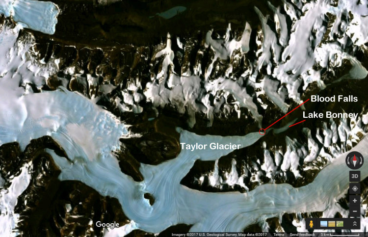 The Taylor Glacier is about 54 kilometers long and, like all other McMurdo Dry Valleys which are full of “cold-based” glacier. That is, they are literally frozen to the ground below unlike wet-based glaciers, that are not. They are also comparatively flat and smooth on the surface unlike wet-based ones, which have deep cracks or fractures. However, Taylor glacier, despite being part of the Dry Valleys, is not frozen to the rock, probably because of its salt content in the crystalized ancient seawater imprisoned below. The source of Blood Falls, is a subglacial pool of unknown size with over 400 meters (1,300 feet) of ice above it and several kilometers away from its outlet.