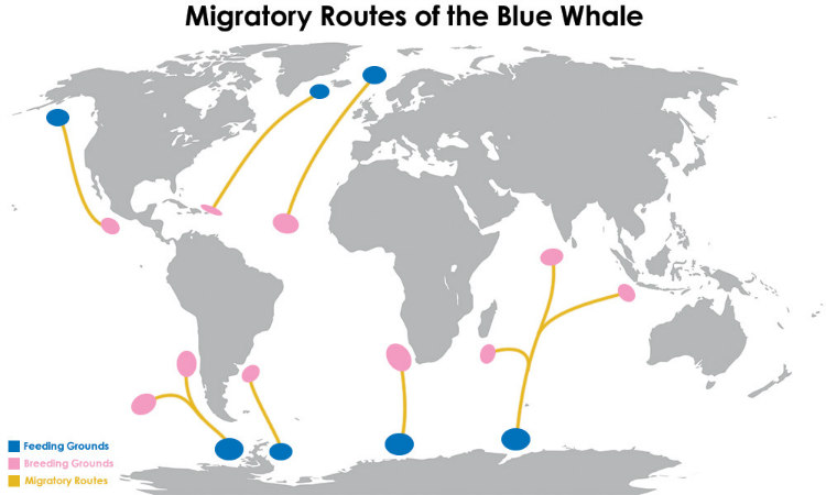 The largest populations of krill are found in the Antarctic and constitute the main food source for seals, penguins, fish, squid, as well as whales. The blue whales gorge on Antarctic krill during feeding season. As they gain more energy than they spend they build substantial energy reserves. They spend these reserves when migrating for breeding to warmer parts of the oceans near the equator, where krill is scarce.(source)