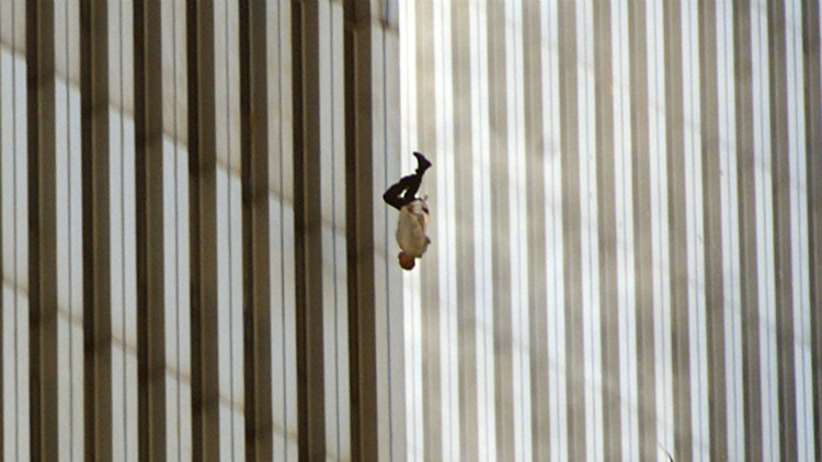 The man doesnât appear to be struggling. Rather it seems like he accepted his fate. It was not clear that if the man chose to jump from the tower to escape from smoke, or if he was thrown out due to the explosion. The man has become an icon of the struggle of the civilized world against terrorism and the aftermath of 9/11 attacks.(1,2,3)