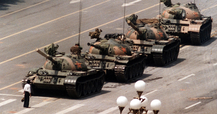 The Chinese troops had attacked pro-democracy demonstrators camped on the plaza, and the tanks featured in the image are those which were traversing through plaza the next day. The man refused to budge when the front tank tried to move around. He also tried climbing one of the tanks to halt them.