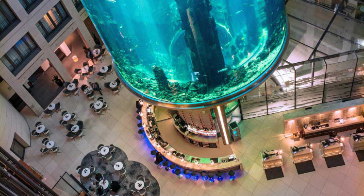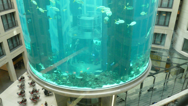 Located in the Radisson Blu Hotel, Berlin-Mitte, Germany, the AquaDom is a tall, cylindrical structure of acrylic glass with a built-in, transparent elevator. Visitors can take the elevator that travels through the center of the cylinder to view various aquatic creatures.