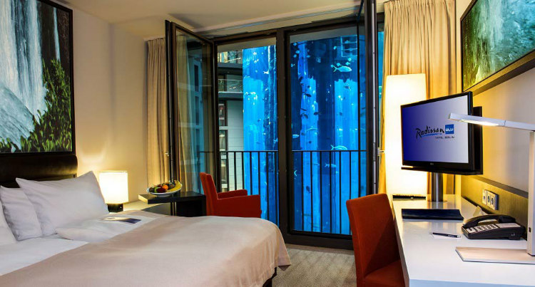 A spectacular view of the AquaDom through the door of one of the hotel’s rooms. Image Source: radissonblu