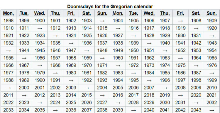 In 1973, an English mathematician named John Conway devised an algorithm called the “Doomsday Rule” to determine the day of the week for any given date. The algorithm was inspired by the work of Lewis Carroll, mathematician and author of Alice in Wonderland,  on a perpetual calendar algorithm. It provides a perpetual calendar as well because the Gregorian calendar, the most widely used calendar in the world, moves in 400-year cycles. The day of any date is calculated by using the fact that certain day of the week called the “doomsday” in any given year is always the day of the dates 4/4, 6/6, 8,8, 10/10, 12/12, and the last date of February. For example the doomsday for the year 2017 is Tuesday, which means all the above mentioned dates are Tuesdays.(source)