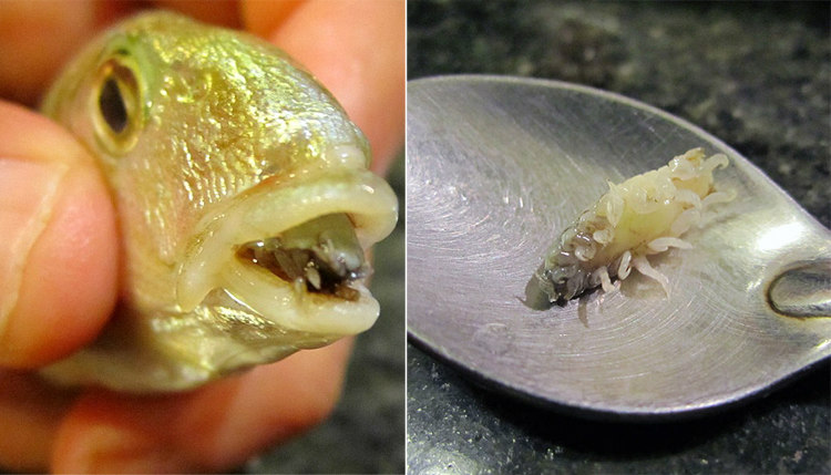 The parasite Cymothoa exigua, also known as the “tongue-eating louse,” enters the fish through its gills. The female then attaches itself to the tongue while the male attaches itself behind and beneath the female on the gill arches. It then cuts off the blood supply by severing the blood vessels. This causes the tongue to fall off after which the parasite attaches itself to the remaining stub of the tongue. The parasites feed either on the fish’s blood or on its mucus. After the fish’s death, the parasite detaches itself from the mouth, leaves the mouth cavity, but attaches itself to the body.(source)
