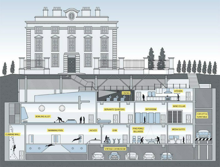 The idea of building downwards is a way for the billionaires and their architects to get around the laws restricting construction of tall buildings in the city. As of 2012, more than 800 planning applications for basement extensions were accepted and only 90 were refused. Image Source: dailymail