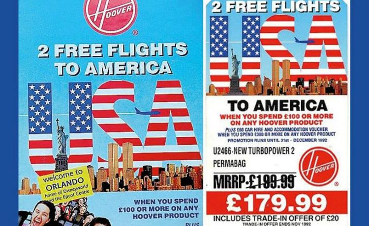 In the 1990s the British division of The Hoover Company was having a surplus of washing machines and vacuum cleaners sitting in their warehouse gathering dust. In order to sell them, Hoover began a marketing promotion in August 1992. According to the Hoover free flight promotion, a purchase of £100 of Hoovers products would make them eligible for two round -trip tickets to Europe. Later the destination of flights was expanded and included the USA. The actual cost of the same flight was several times more than £100. So, it was a very cheap bargain.