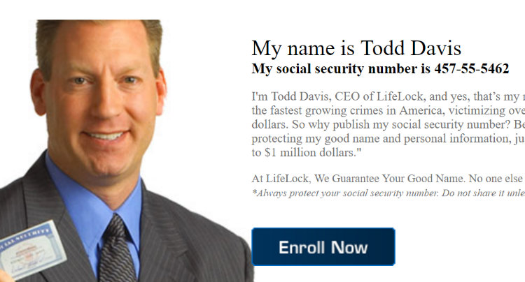 Lifelock is an American company that provides identity theft protection. It was co-founded in 2005 by Todd Davis and Robert J. Maynard. When Lifelock began promoting its services in 2006, it was so confident in its product that, as a symbol of trust, CEO Todd Davis’ Social Security number was displayed on its advertisement. In 2007, their security system was breached, and Todd Davis himself became a victim of identity theft. The crime was discovered when a company called on his wife’s cell phone regarding an unpaid debt. Upon investigation, it was found that someone used Todd Davis’ identity and obtained a loan of $500.