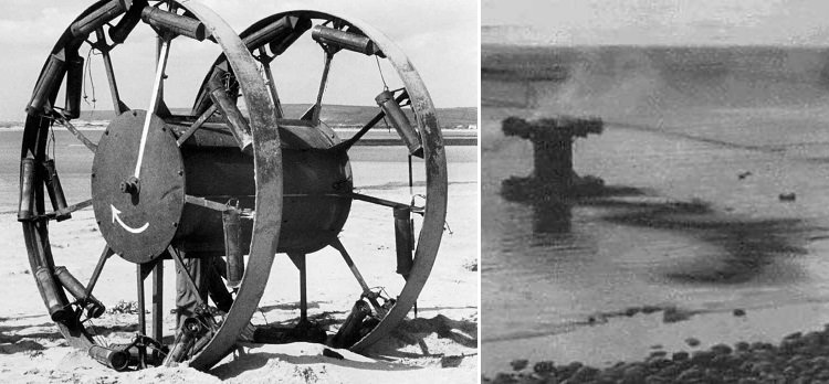 5 In the final years of WWII, the British military designed a rocket-propelled cart called the “Panjandrum.” It was designed to speed across a beach and blow a tank-sized hole in concrete walls. Testing revealed it was dangerously unpredictable.Image source: wikipedia