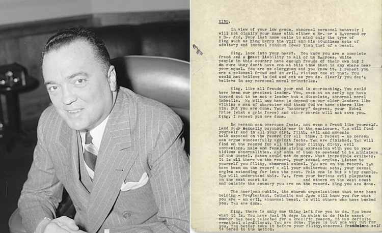After the 1963 March on Washington for Jobs and Freedom, Hoover singled out Martin Luther King Jr. as a major target, systematically bugging his home and hotel rooms. The FBI even went as far as sending King a “suicide package” containing audio recordings of his sexual indiscretions and a letter telling him to commit suicide. The program was kept secret until 1971 when the Citizen’s Commission to Investigate the FBI burgled several documents from an FBI office and passed them to news agencies.(source)