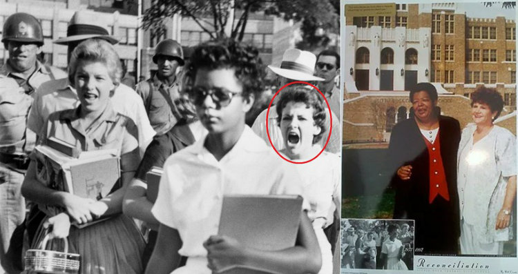 In the famous photos of the event, one teenage girl can be clearly seen screaming at Eckford. That girl was Hazel Bryan. Bryan and Eckford became friends 40 years later when they both attended an anniversary commemoration event. They posed for a âreconciliationâ poster together. The photograph was taken by Counts, the same photographer who took the original image. But by early 2000, their friendship ended.Image source:1,2