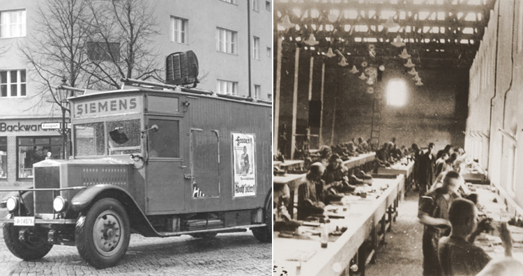 The Siemens Company was quick to take advantage of the rise of the Nazis in Germany by building factories near concentration camps in Auschwitz and Buchenwald. They employed hundreds of thousands of slave workers to manufacture all sorts of goods for the German military. They were put in charge of power generation, communications, and rail infrastructure, among other things.
