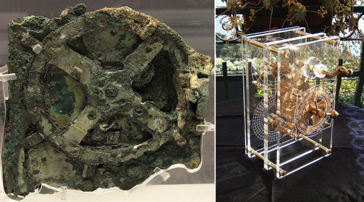 Found in the sunken wreckage of a 2,000-year-old Greek cargo ship, the circular bronze artifact, Antikythera mechanism, contains a maze of interlocking gears and mysterious characters etched all over its exposed faces. Archaeologists believe it to be a highly intricate astronomical calculator, used as a navigational astrolabe or to keep track of dates of the Olympic games.Image Source: 1 fragment of Antikythera mechanism,2 modern depictions of Antikythera mechanism