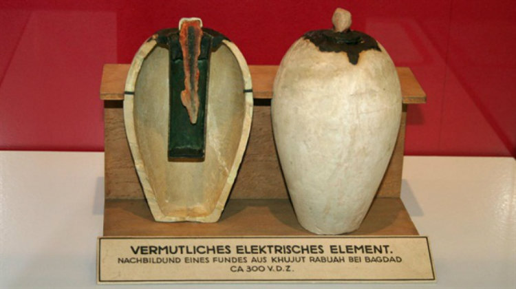 In 1938, German archaeologist Wilhelm Konig unearthed a clay jar while working in Khujut Rabu, outside Baghdad, Iraq. The five-inch clay jar contained an iron rod encased in a copper cylinder kept inside the jar. The vessel showed signs of corrosion. Upon examination, it was found that the vessel once held some acidic agent such as wine or vinegar. Konig hypothesized that the vessel functioned as a battery and was used for electroplating.