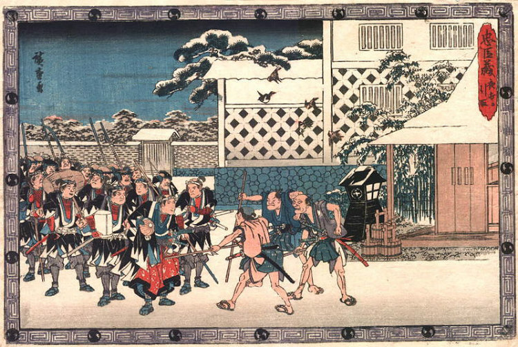 Of Asano’s 300 men, 47 swore a secret oath to avenge their lord even though the punishment would be severe. Knowing he would be attacked, Kira made sure he was under heavy protection. To mislead Kira, the ronin leader Oishi left for Kyoto, spent time at brothels and taverns, and acted obscenely. One day he got so drunk that he fell asleep on the road. Soon, Kira lowered his guard believing the reports of Oishi’s drunkenness and thinking the ronin really were cowardly. In the meantime, the rest of them collected all the information they needed.