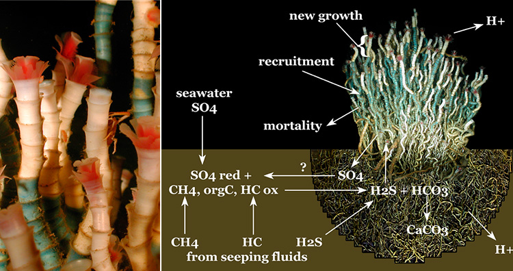 Tubeworms sustain themselves on sulfide and other nutrients found at the seeps. A paper published by the Penn State research team in 2003 says that the tubeworm does not discharge its waste sulfate into the ocean, but down in the soil. This causes sulfide-producing microbes to grow, which in turn could help the tubeworm to live longer. Â Their long lifespan could also be a result of a lack of solid growing surface in the Gulf of Mexico which is primarily mud-bottomed.(1,2)
